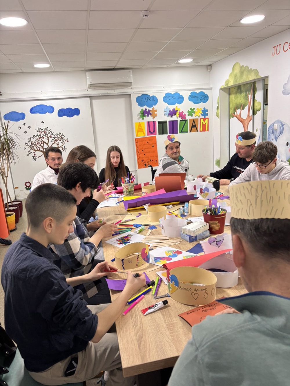Učenici OŠ ,,Marko Miljanov'' i naši korisnici straiji od 27 godina su zajedno obilježili Međunarodni dan osoba sa autizmom. Kroz druženje, razgovor, osmijehe i zajedničke aktivnosti, svi smo imali priliku da se podsjetimo koliko su razumijevanje, prihvatanje i podrška važni. Zajedno su pravili krune ukrašene simbolima autizma, stvarajući male ali značajne podsjetnike na prihvatanje i raličitost. Poseban kutak bio je ,,zid poruka'', gdje su svi ostavljali lijepe misli, riječi podrške i poruke pune empatije.