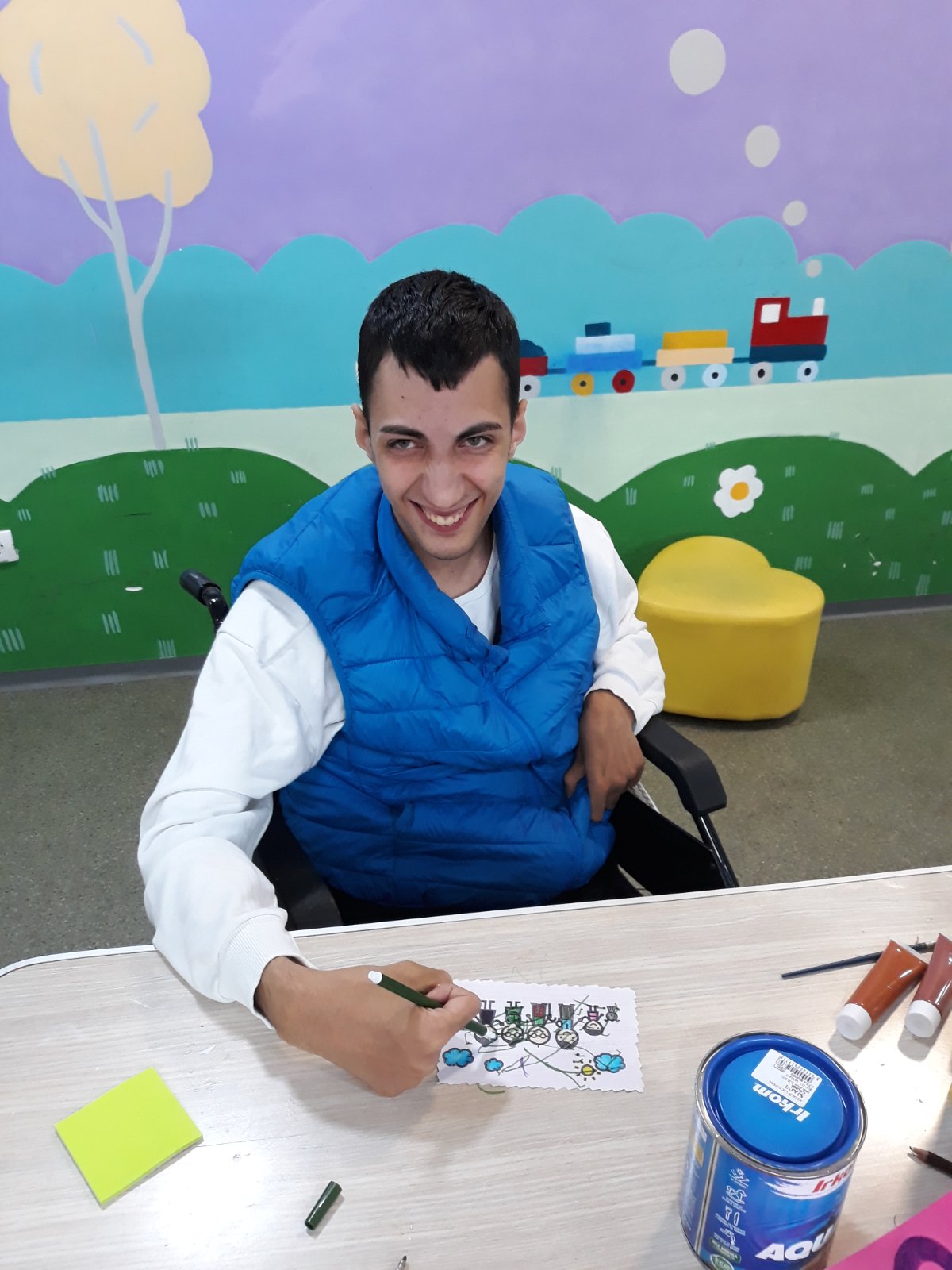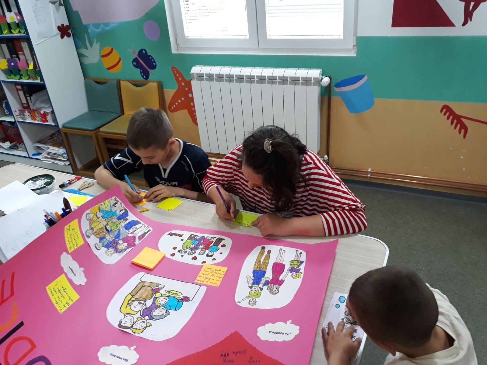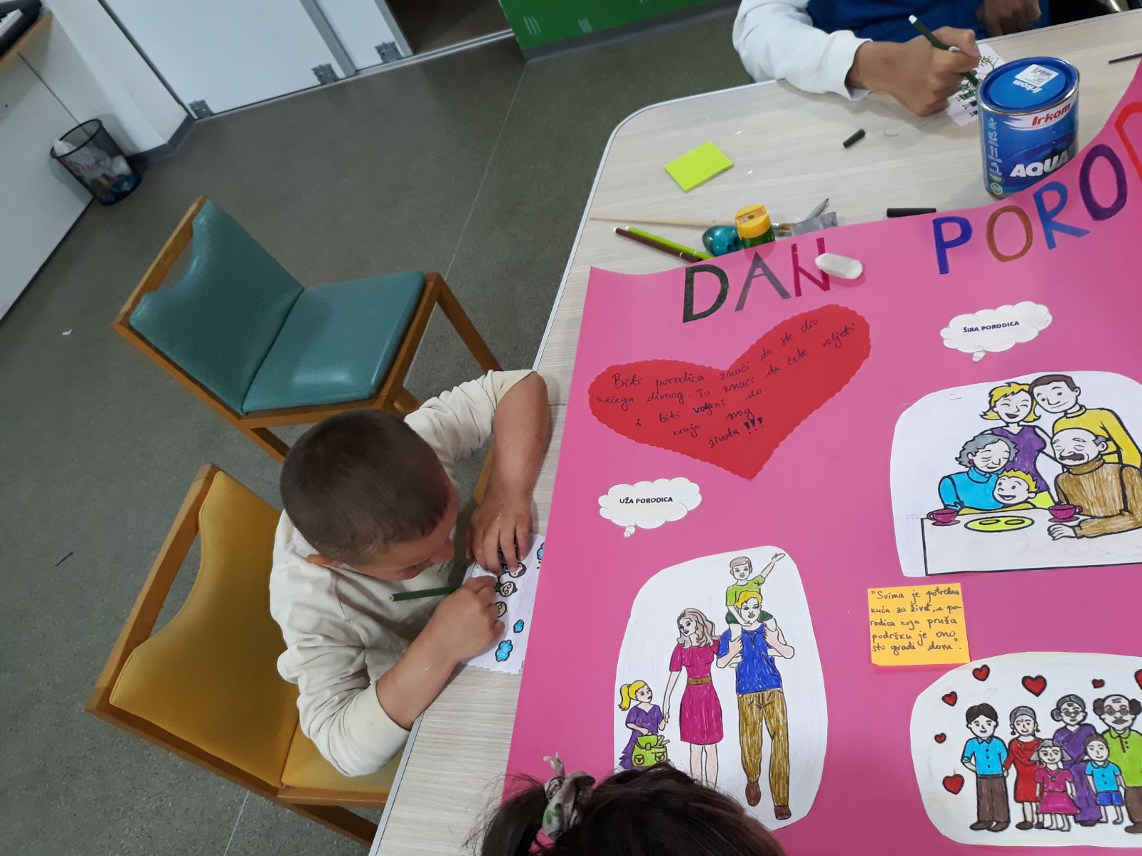 Djeca su pisala svoje poruke šta za njih predstavlja porodica, na stikerima koje su potom lijepili na hamer papir.